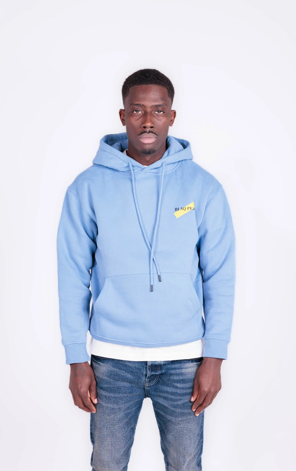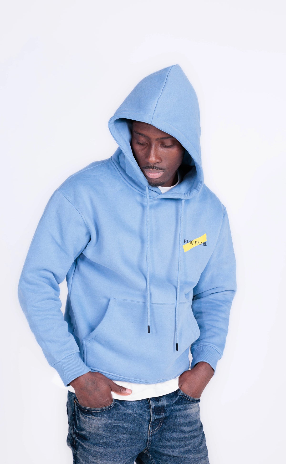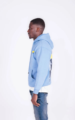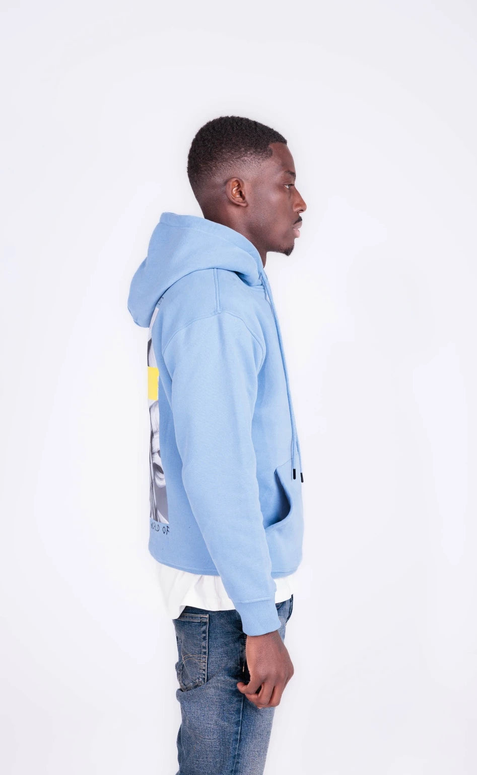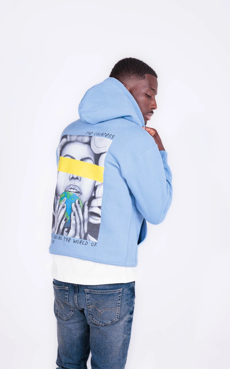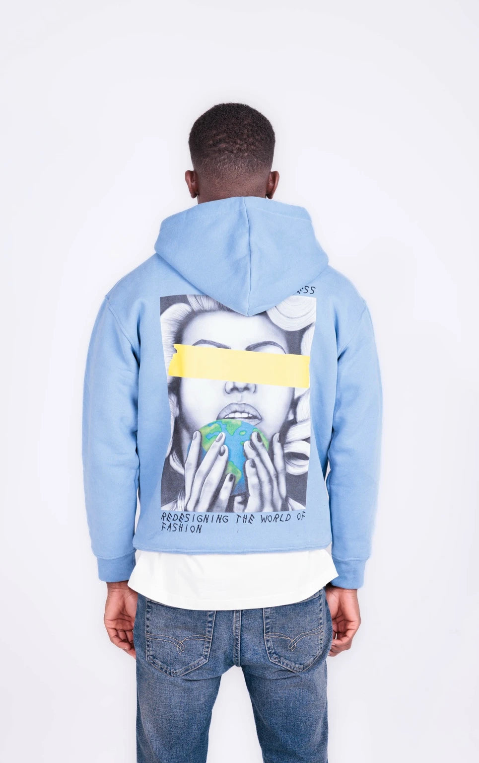 Wrapped in a calm baby blue exterior, this hoodie holds a loud truth on its back — a woman, blindfolded in yellow, cradling the Earth.